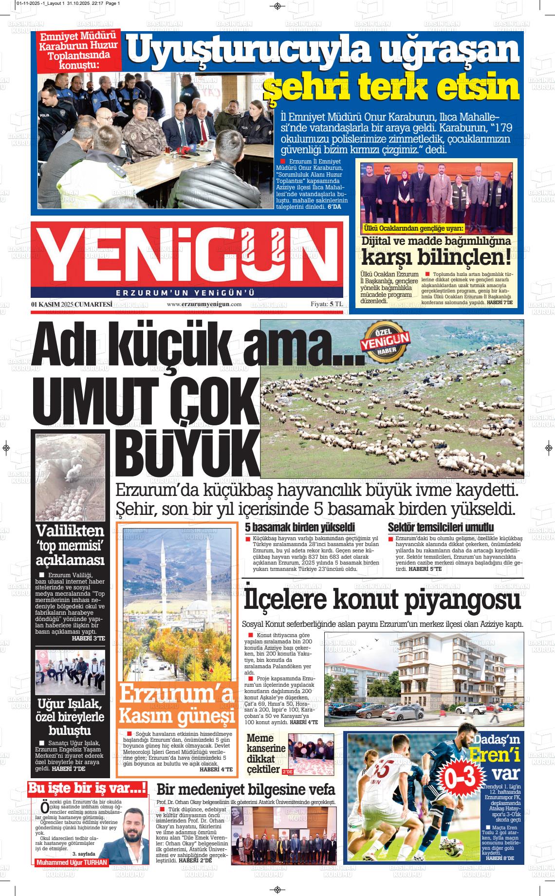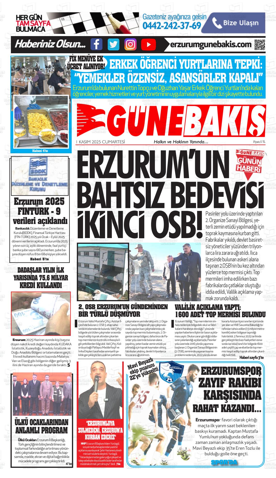 Erzurum Yerel Gazeteleri 02 Kasım 2025, Pazar Günü Manşeti