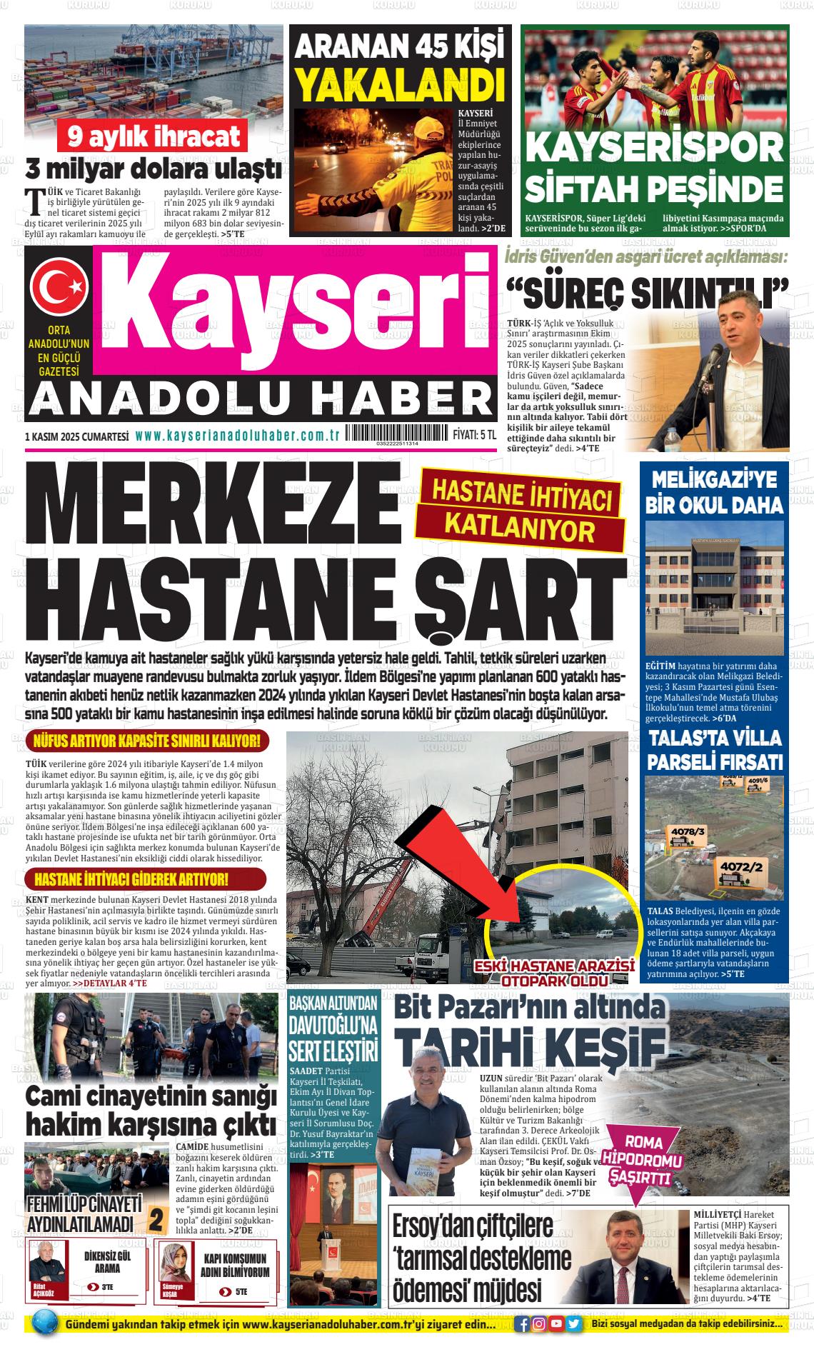 Kayserİ Yerel Gazeteleri 01 Kasım 2025, Cumartesi Günü Manşeti