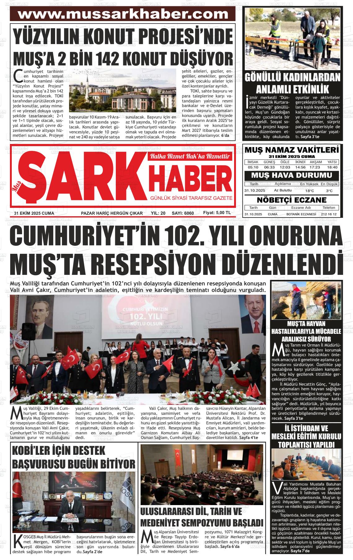 Muş Yerel Gazeteleri 01 Kasım 2025, Cumartesi Günü Manşeti