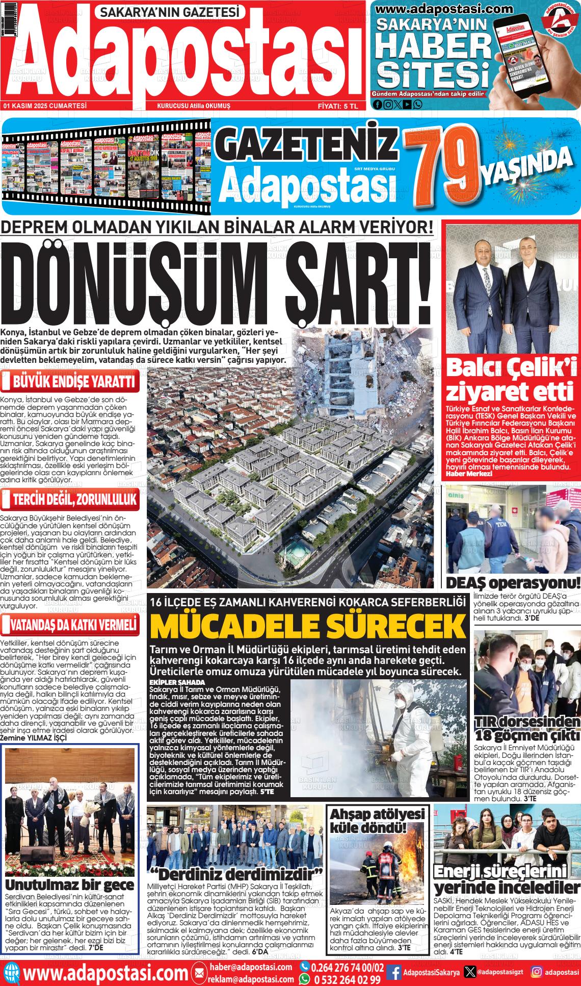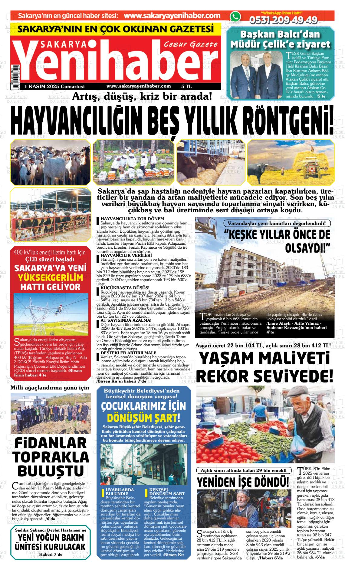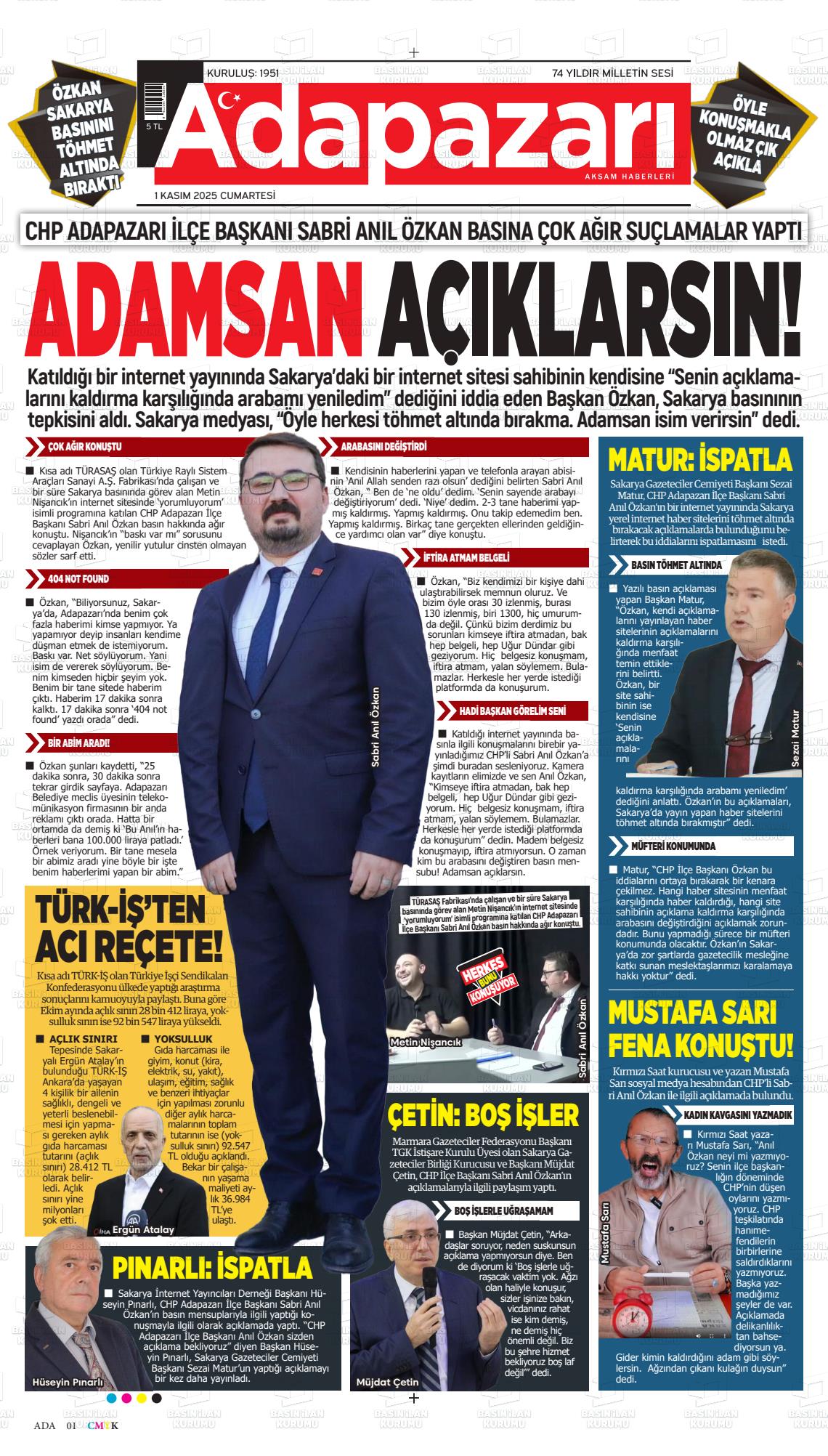 Sakarya Yerel Gazeteleri 02 Kasım 2025, Pazar Günü Manşeti