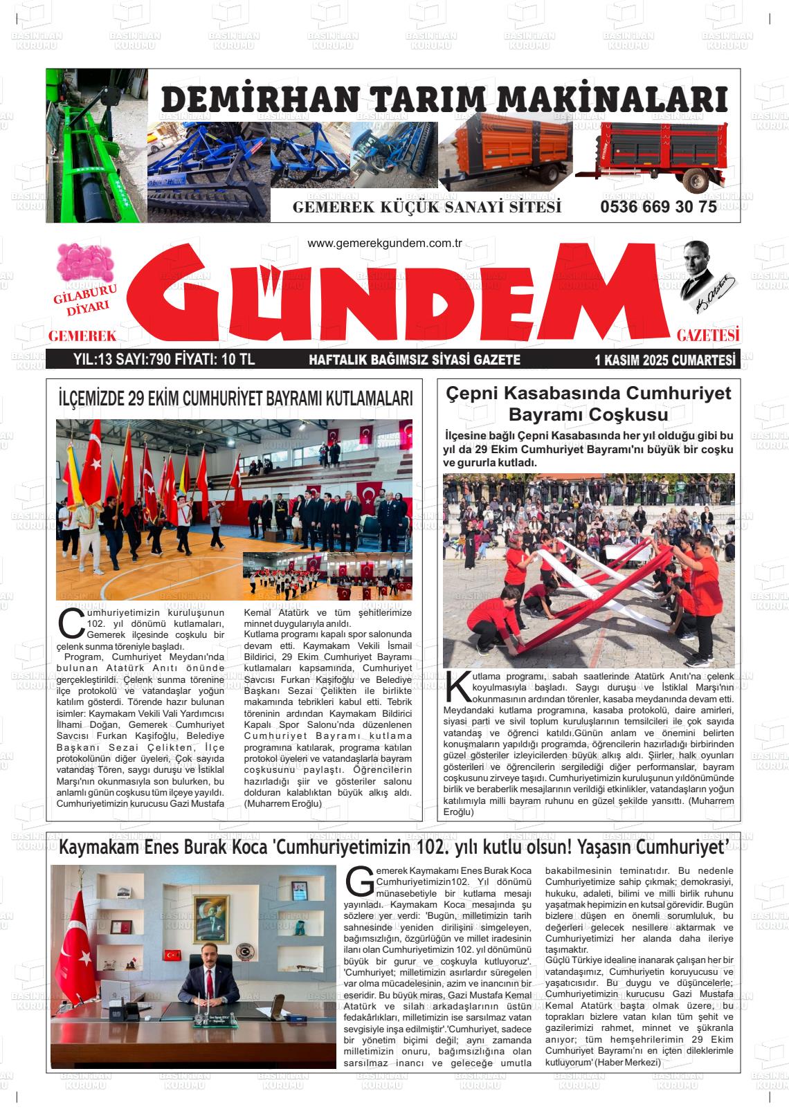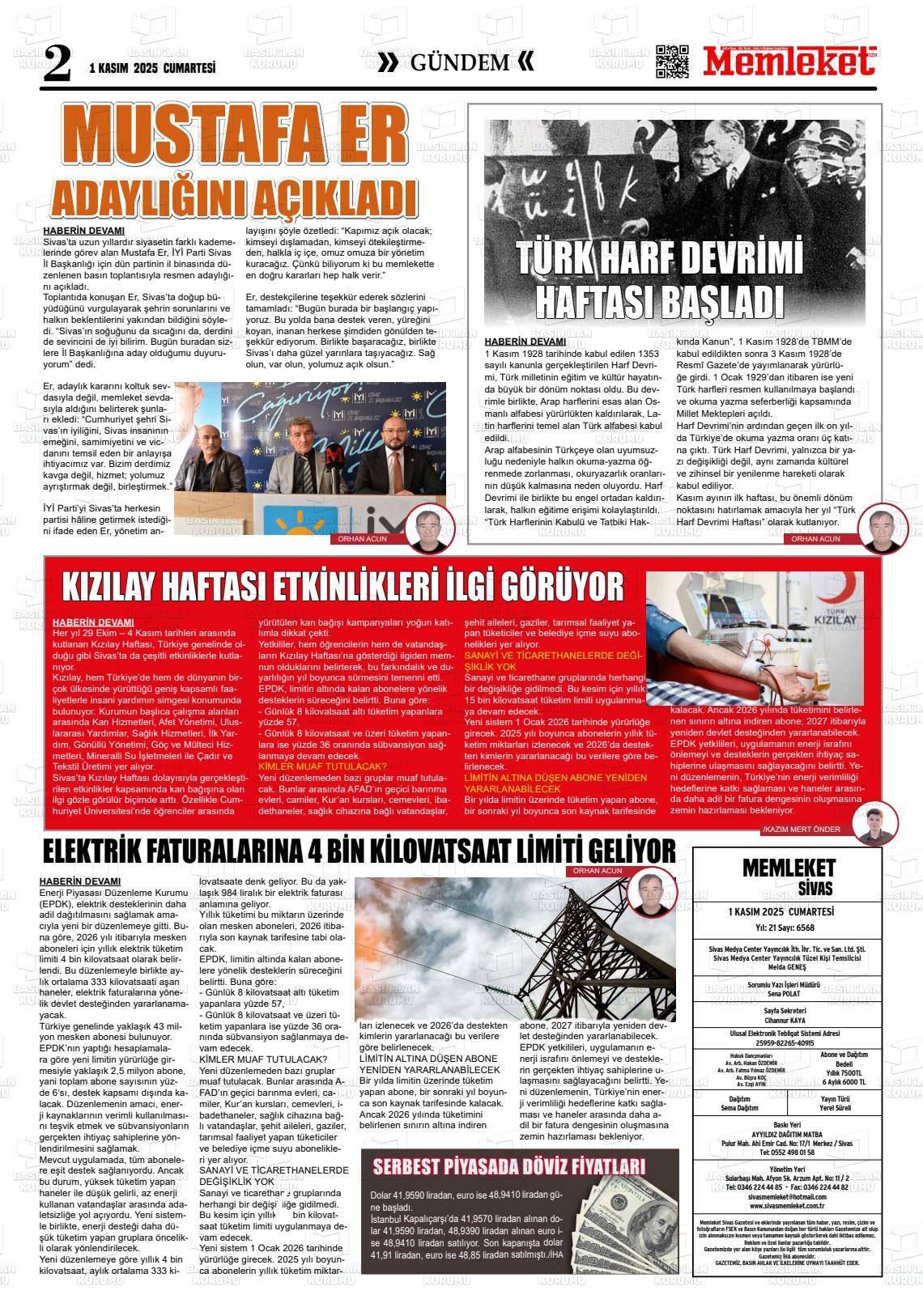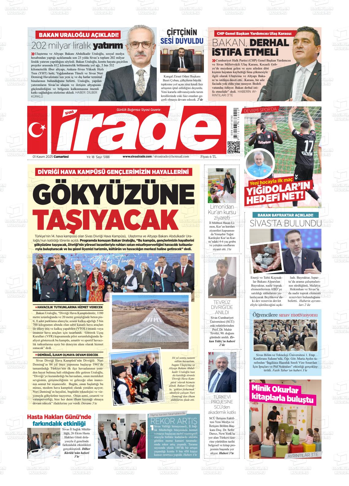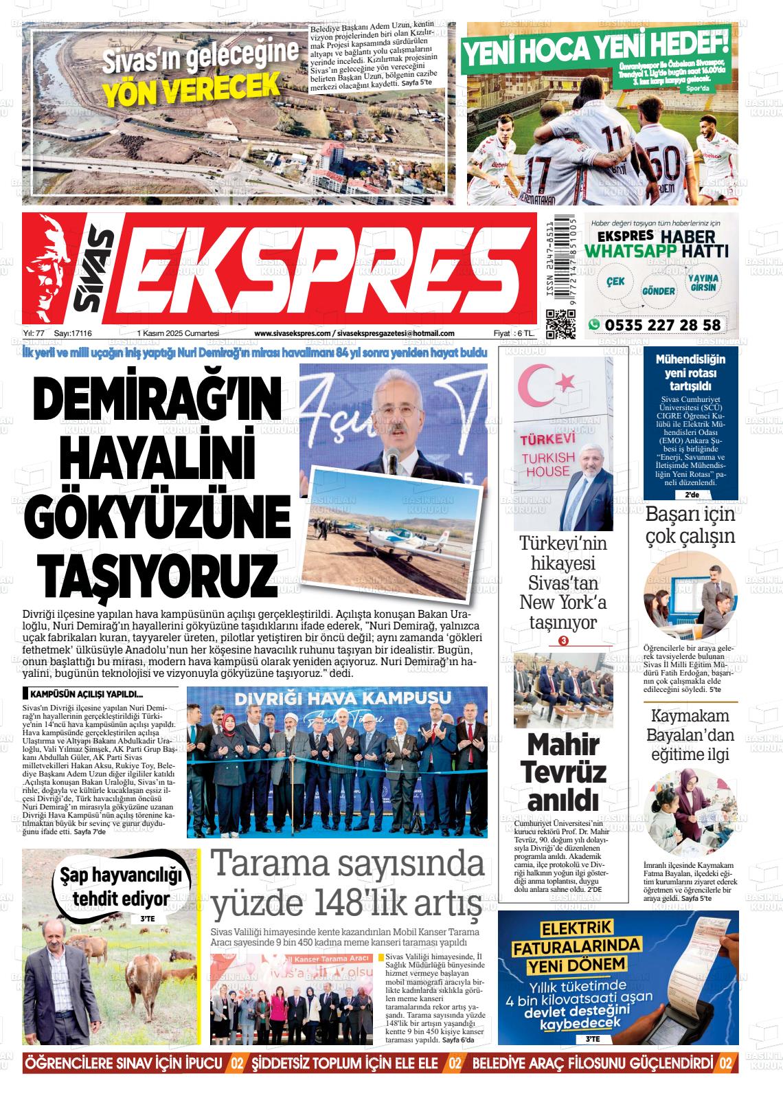 Sİvas Yerel Gazeteleri 01 Kasım 2025, Cumartesi Günü Manşeti