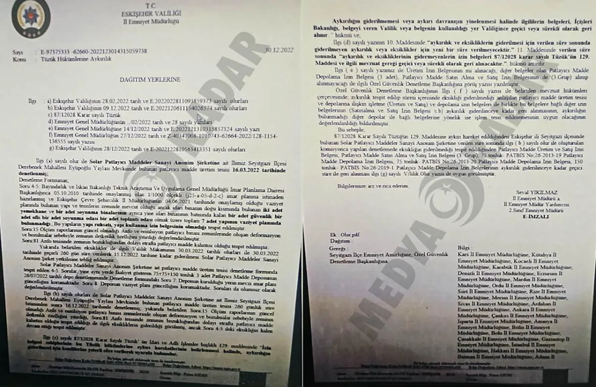 Eskişehir Emniyet Müdürlüğü’nün 2022’de Seyitgazi’deki üretim tesislerinde yaptığı denetimlerde, 7 adet yapının devlete bildirilen vaziyet planında yer almadığı ve bu yapılar için yapı kullanma izin belgesinin düzenlenmediği belirlendi. Ekipler, anfo ve emülsiyon patlayıcı binası zeminlerindeki deformasyonun tehlike arz ettiğini ve binalarda tespit edilen patlayıcı madde kalıntılarının büyük risk oluşturduğunu raporladı.